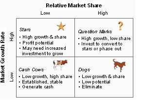 - Dog: Thị phần ít ỏi và không có khả năng phát triển. Có thể cho ra đi, nhưng đó chỉ là kế sách cuối cùng. Nếu nước vẫn còn tát được thì cứ tát nhưng phải hết sức cẩn thận với lượng tiền vận hành chúng. Lối thoát cho Dogs là cần định hướng lại chiến lược và tìm ra thị trường ngách phù hợp