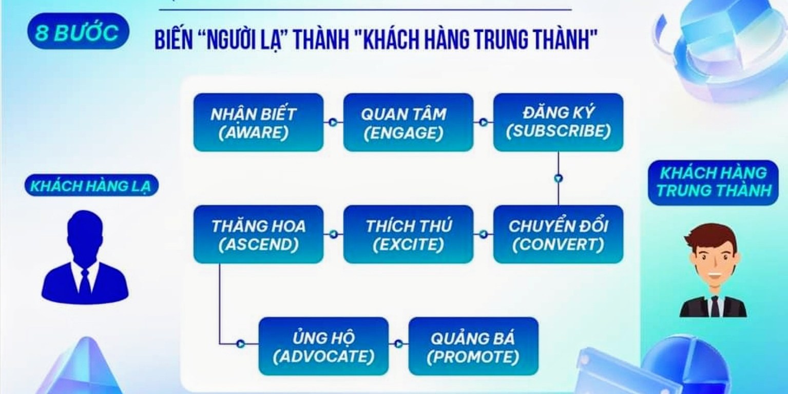 Dựa trên hình ảnh về hành trình giá trị khách hàng gồm 8 bước để biến “người lạ” thành “khách hàng trung thành”, chúng ta có thể xây dựng các nội dung email phù hợp cho từng bước trải nghiệm của khách hàng. Dưới đây là bài blog mô tả chi tiết về các email content cho từng bước trải nghiệm này.